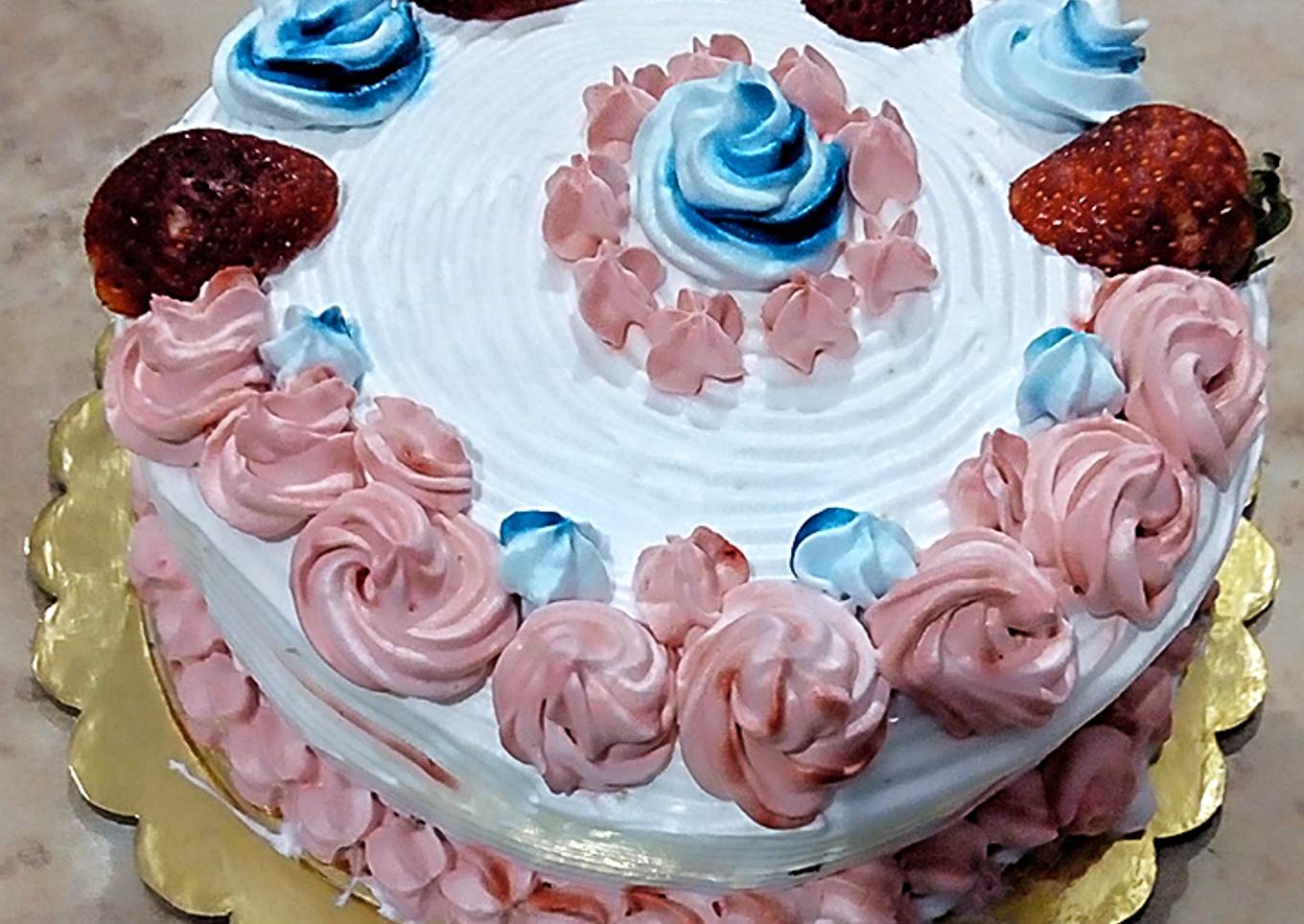 - Use pallet knife and spread the cream between two layers, apply the cream on the cake and make a smooth surface.For the dollops fill the piping bag fitted with any nozzle with whipped cream and make the design on the cake.