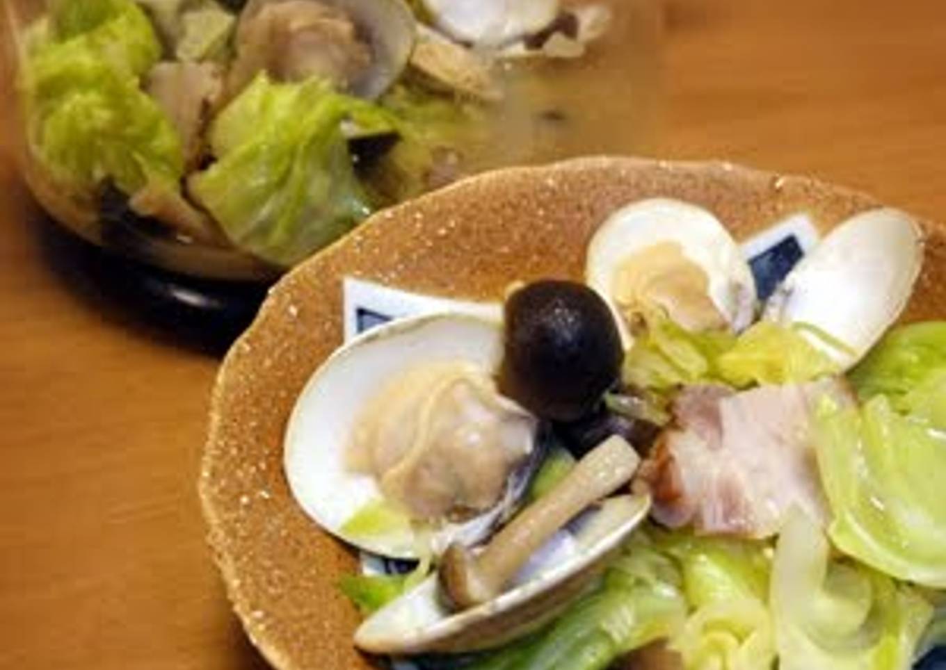 - Place the sliced cabbage, the shimeji, the clams, the bacon, and the roughly chopped cabbage, in that order, into a heat-resistant bowl.